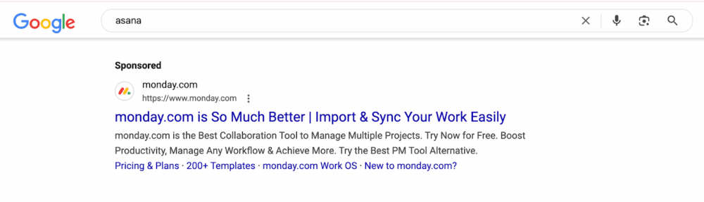 Take monday.com, for example, a project management tool bidding on their rival, Asana. When you search for Asana, Monday doesn’t tiptoe around it, they come out swinging with: “monday.com is So Much Better”